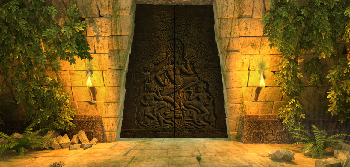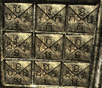 Direction Elevation Location North Horizontal To left of lower left corner of door Hidden behind fern at far right Up Right side of lintel To upper left of lintel, behind some vines Down Lying flat at far right East Horizontal Lying flat in front of right statuette Up At right of top stone carving On right wall, at about the same height South Horizontal To left of the lower left corner of door To left of the upper left corner of door To right of the lower right corner of door At extreme lower right corner of screen Partially hidden in some foliage to left of left-hand torch Up Half-hidden on top of lintel Midway up right wall West Horizontal At lower left corner of bas-relief At lower right corner of bas-relief Lying flat between 2 blocks to lower right of bas-relief Lying flat at extreme lower right corner of screen Up At right edge of top stone carving