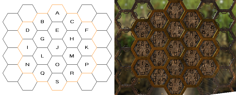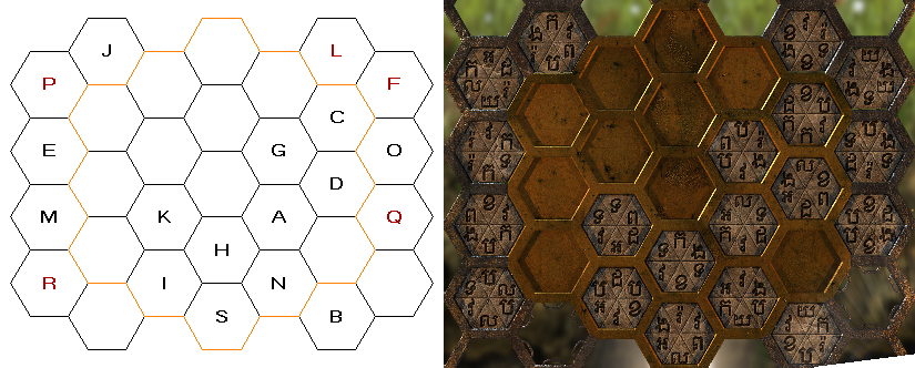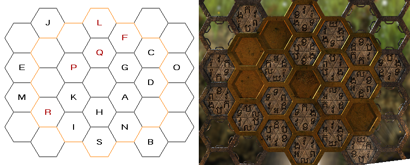 R2 U D2 R3 U4 L2 D* L DWhen the puzzle is solved, the moving blades are stopped. Enter the next room to the west and explore it to identify its cardinal directions:R U R D2 R3 U4 L2 D* L D