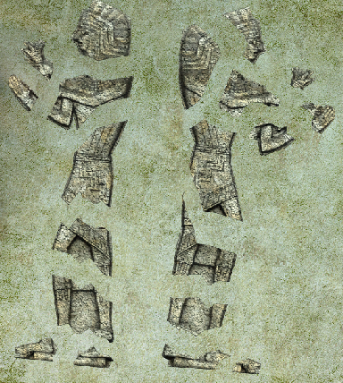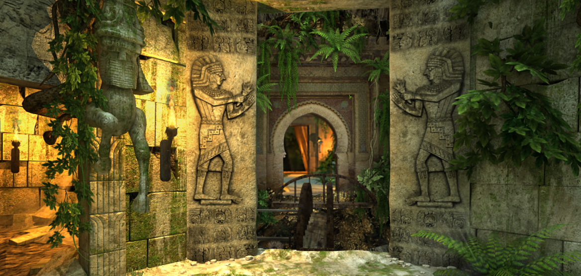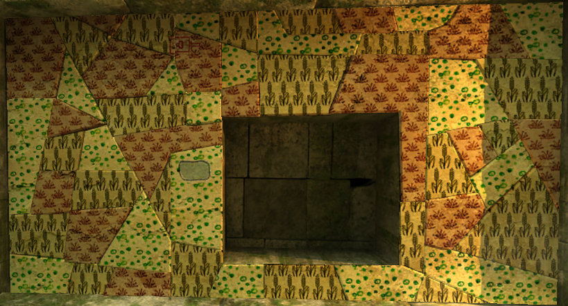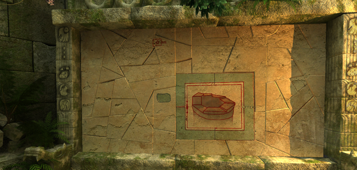 Direction Elevation Location North Horizontal Rectangular template just left of the left stone figure's head Narrow stick below the left column Green pigment pile at the foot of the right column Up Thin horizontal stick in the mouth of the stone serpent at the left side of the lintel Decorative panel a couple of stones above the center of the lintel East Horizontal Cream-colored canvas at the lower right corner of the trapezoidal opening Up Decorative panel above the yellow wall medallion Yellow pigment pile to the lower right of the yellow wall medallion Down Two red pigment piles at the foot of the steps South Horizontal Purple pigment pile at the upper right corner Polygonal flat object halfway up the left column Up Thin dark stick in front of the left snake head carving Light-green canvas about 3/4 of the way up the wall over the center of the lintel Roughly L-shaped piece at far right, next to the right navigation arrow Down Light green pigment pile West Horizontal Red pigment pile at the lower left corner Yellow pigment pile at the lower center Cream-colored canvas above the (?) icon in the status bar Up Wooden rectangle on the wall at center