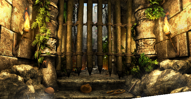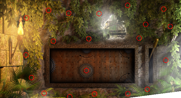 Return to the Fresco Room and face northwest. Enter the alcove and clear away the foliage and stones from the rectangular gearbox and its lever at right. Solve the HOG for 20 gears: