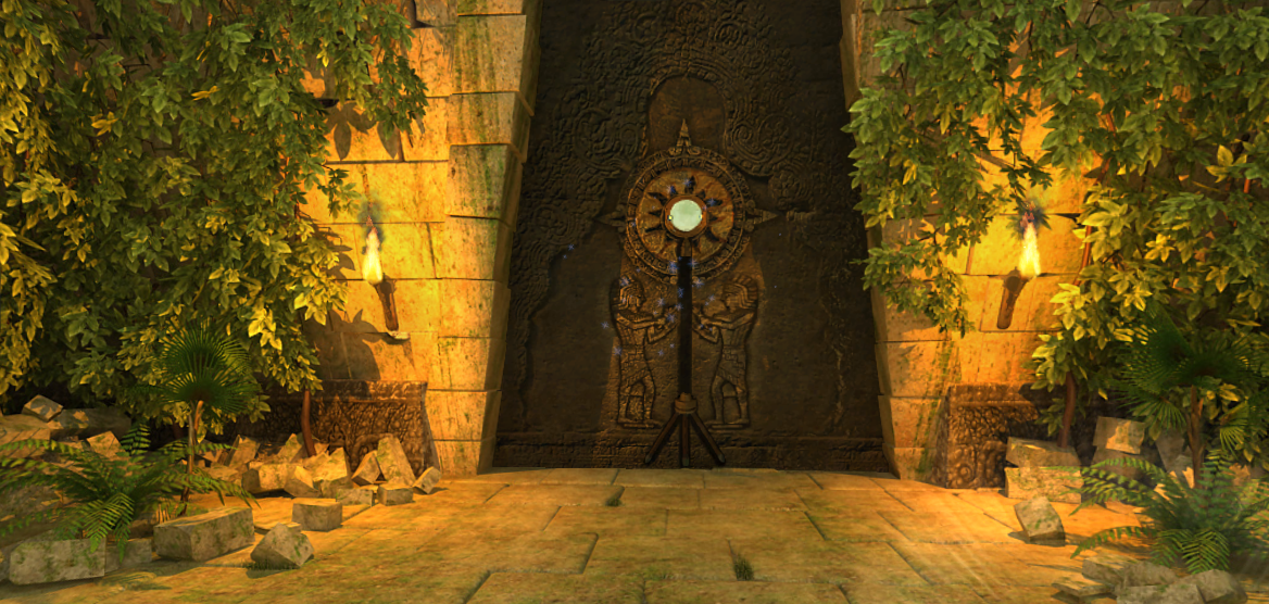 Direction Elevation Location North Horizontal Touching the bottom left of the opening Hiding behind a fern at the upper right of the opening Up Underneath a white flower at far left In the approximate direction pointed to by the seated figure in the bas-relief Rectangular piece exactly on the left corner of the bas-relief East Horizontal Hiding behind a fern at the lower right of the opening Halfway up the column of flowers to the right of the opening A lighter-colored spot at the extreme upper right corner of the screen Up A bright white piece on a string of foliage at the upper left corner of the screen Near the center of the screen, behind a hanging green vine Behind an undulating tree root at left center South Up Yellowish triangular shape near the center of the screen Squarish piece just below a bright red flower in the center region of the screen On ledge near the right side of the screen West Horizontal Triangular piece to the left of the lower-left portal corner Rectangular piece near the lower left corner of the screen Up Behind a fern near the upper right corner of the portal Smaller piece just to the right of the top point of the portal At left edge of white/orange flowers to the left of the portal