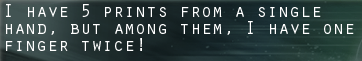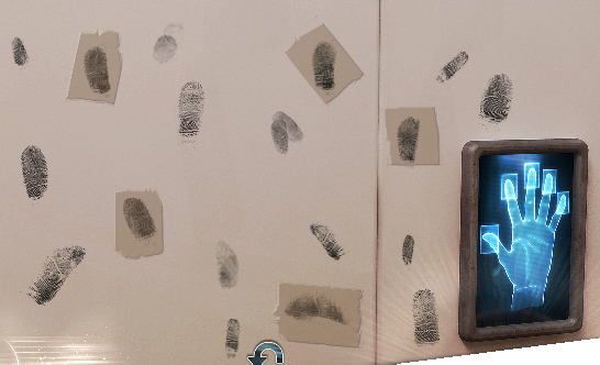 Select the five correct prints using the sticky tape on each one. This is a difficult puzzle since little information is returned about which 5 of the 15 prints should be chosen. In the absence of any other information, there are 3003 different sets of 5 prints (126 in the Easy version of the puzzle). While examining the angles of prints wasn't fruitful, the correct prints are generally of about the same size (i.e., small and large prints don't seem to be mixed), as indicated by the single clue provided for the puzzle. Note the sideways print at lower center that seems to be thumb-shaped. However, beware of a comment about having prints for the same hand, as that hand does not seem to be the one being sought. After a fair amount of trial and error, the correct solution is