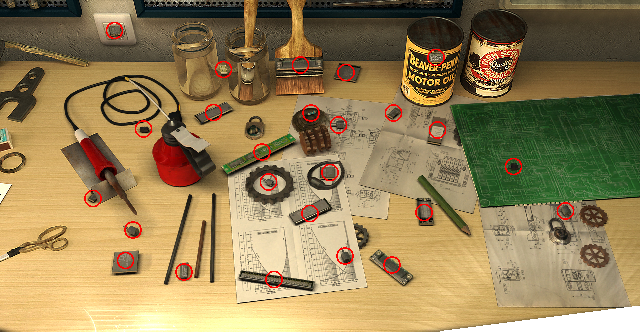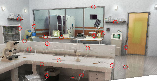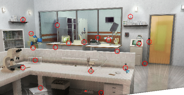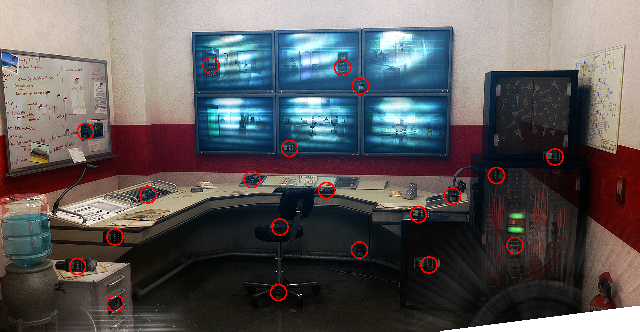 Enter the red door into the Video Surveillance Room and zoom in on the control console beneath the six video screens. Click on the defective digital recorder in the USB-4 slot at right. Solve the HOG for 20 recorders: