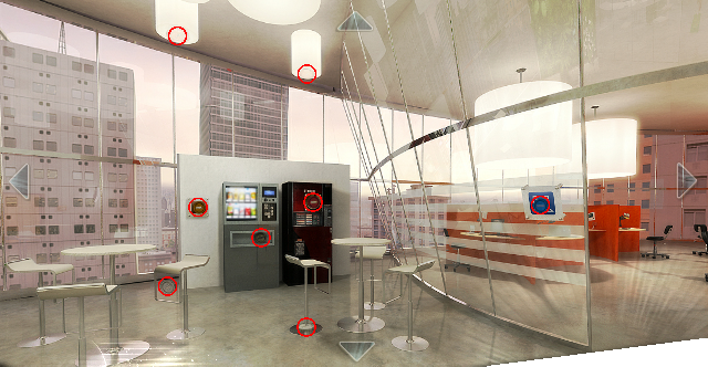 Move the X88 component from inventory to the beaker at position 7. Back out and use the map to go to the Lounge. Zoom in on the vending machine there. Click on the coin slot, then back out and rotate around to solve the HOG for 20 tokens:![]()