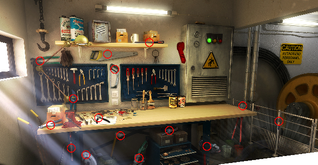Inside the machinery room, open the cabinet and try to remove the motherboard. Take the middle one of the 5 red-handled screwdrivers from the blue pegboard. Use the screwdriver on each of the four corners of the motherboard. Zoom in on the motherboard and solve the HOG for 25 components: