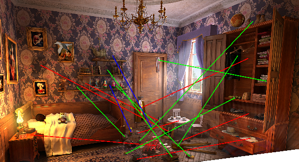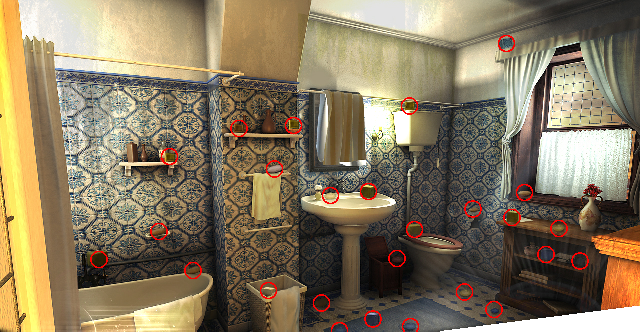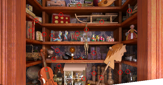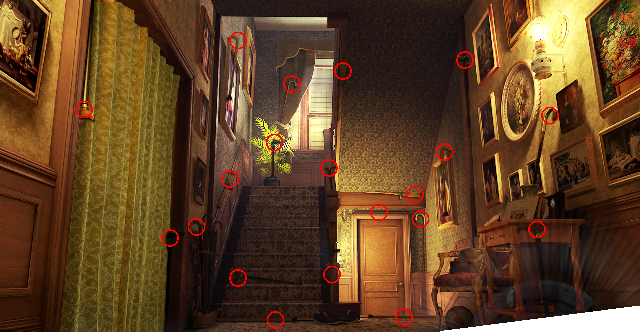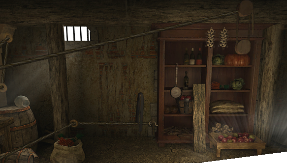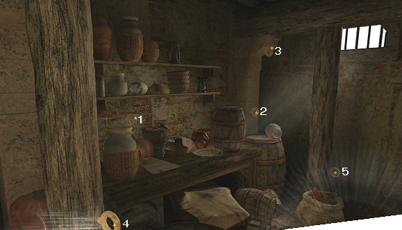 Viewpoint Location of sample Empty shelves at center Just below window Apple create at right Lower left side of roof support pole Above left corner of apple crate 2 windows Directly above grayish plank against the wall Upper right corner of right-hand window Stairs at center Bottom of brick wall just past the bottom of the stairs Immediately above left basket of apples 3 stacked barrels Upper left corner of arched shelves Top of right edge of shelves Rack of pots at right Midway up stone support column at center Right of wooden table Just below third pot from the right Rack of pots at left Immediately above pumpkins Network of ropes Behind knocked-over vase on lower shelf Behind black flagon at right side of lower shelf