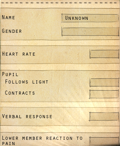 Light the Burnt-out candle in the fireplace. Zoom in on the patient again and put the Lit candle onto his head. Drag the candle around until the pupil contracts. Exit the closeup and answer some questions:![]()