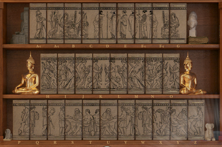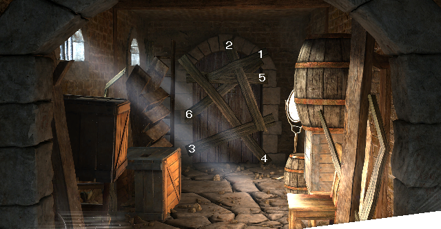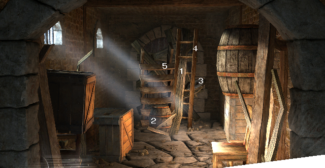 Rotate right once, then click the rope end on the hook attached to the shelving unit. Use the hoist/pulleys at upper right. Empty the shelves by moving its objects to elsewhere in the cellar. Select an item from the shelves, then rotate in the direction given below (while holding the object) and put the item with similar ones at the indicated location. After each transfer, return to a base position facing the shelves head-on and select the next item:![]()