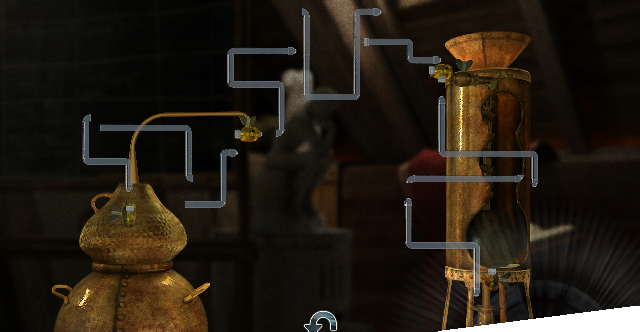 Return to the Attic. Move the Mixture and Tubes from inventory to the table at right. Solve the still assembly puzzle:![]()
