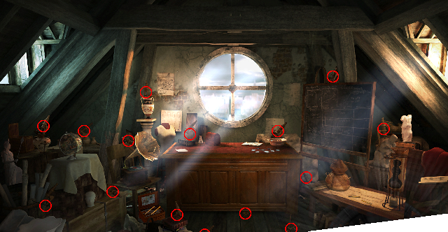 Back out of the room and go upstairs to the Attic entrance. Zoom in on the door to discover you'll need some keys to open it. Exit the closeup and return to the house Entrance. Solve the HOG for 20 keys:
