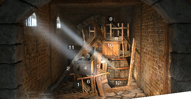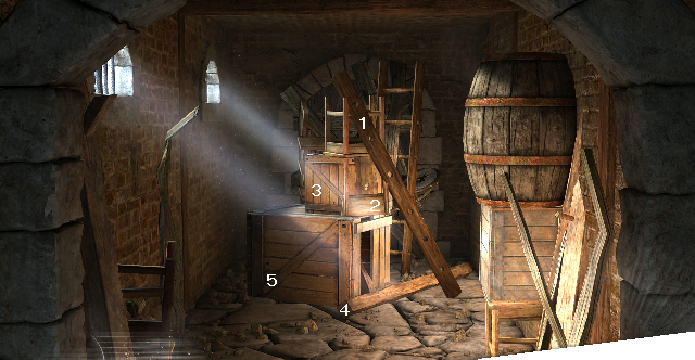 Viewpoint Briquette location Swinging pulleys at right Lower left of shelving unit Lower right of O-bolt on post Swinging pulleys left of center Next to 3 stacked bags at center Two windows On top of planks of wood against wall On top of barrel in foreground Stairway at center Base of stairs in sunlight Halfway up stairs On barrel to the lower right of stairs To lower left of a basket of apples, almost off the screen 3 stacked barrels Front of top barrel Lower right corner of shelves On top of biggest stack of bottles on shelves Front corner of wooden table On rusty container at far right Rack of pots at right Lower shelf of wooden table Next to basket in front of table On top of pot rack on wall Rack of pots at left Right side of woodpile Between pots at upper right corner of screen 5 eyebolts Lower left side of table