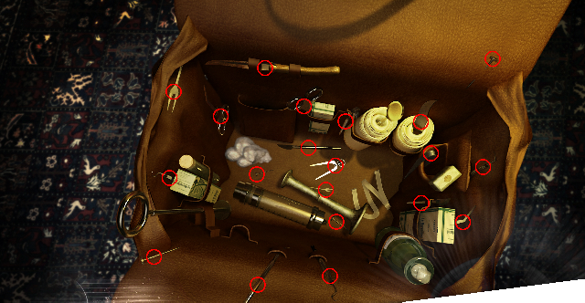 Return to the Entrance and remove the broom that's blocking the Cellar door. Again drag its deadbolt to the left to enter the Cellar. Solve the HOG for 15 saltpeter samples. Slowly scan the walls in this room, watching the glowing cursor for a shrinking diameter and green-colored sparkles. Each viewpoint is reached by rotating right once from the previous viewpoint:![]()