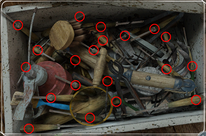 Rotate B onceExit through the trapdoor in the ceiling into the Shed. Click on the door at left, then click on the box of tools at lower left. Solve the HOG for 20 yellow-handled screwdrivers: