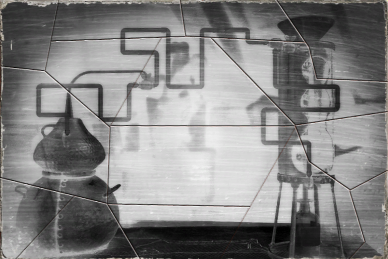 Pick up the Pestle and drag it over the mixture until done. Pick up the Mixture to be distilled and return to the Attic. Click on the table at right, then on the desk. Solve the still jigsaw:![]()