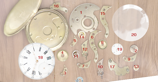 Piece Destination in case 1 Centered 2 Center opening 3 Over two bumps at upper right 4 Over end of Piece 3 5 On top of Pieces 3 & 4 6 Centered vertically against top edge 7 Over hole and bump straight right from Piece 6 8 Over left hole in Piece 7 9 Over Pieces 7 & 8 10 Over hole midway between left edge and center of case, with its curved edge aligned with case 11 Over lower hole of Piece 10 12 Over Pieces 10 & 11 13 Over central hole in case 14 Over circular arcs on Piece 6 15 Over Pieces 6, 13 & 14 16 Over Pieces 15 & 5 17 Over two open holes and below central hole 18 Over whole case 19 Over lower portion of watch face 20 Over whole case