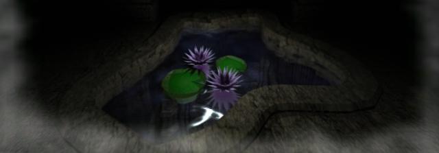 At the bottom of the steps, you will be in a stone room with a glowing pool containing green water lilies, purple flowers and a white P-shaped reflection: