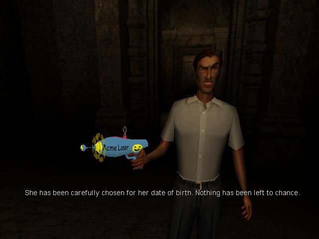 The alternate endgame dialog is the same, but the whole effect is made comical by Dharmesh's choice of weapon.