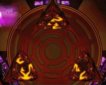 The last puzzle of the game involves manipulating three tetrahedra to project a complete set of symbols in the center. Each four-sided tetrahedron can be rotated about three different axes. Apart from symmetric rotations, there are only two solutions to this puzzle:
