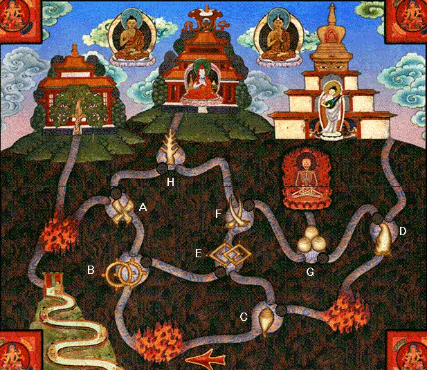 Realm Color Item Gods White Music Asuras Red Sword Animal Green Book Hells Black Heat Pretas Yellow Fruit Human Blue Alms bowlExit the temple through the anteroom, turn right and approach the Mongol tent in the distance. Capture an image of Genghis Khan sitting in the tent. Move left and present Khan's sword to the red buddha, picking up a red stone in return.