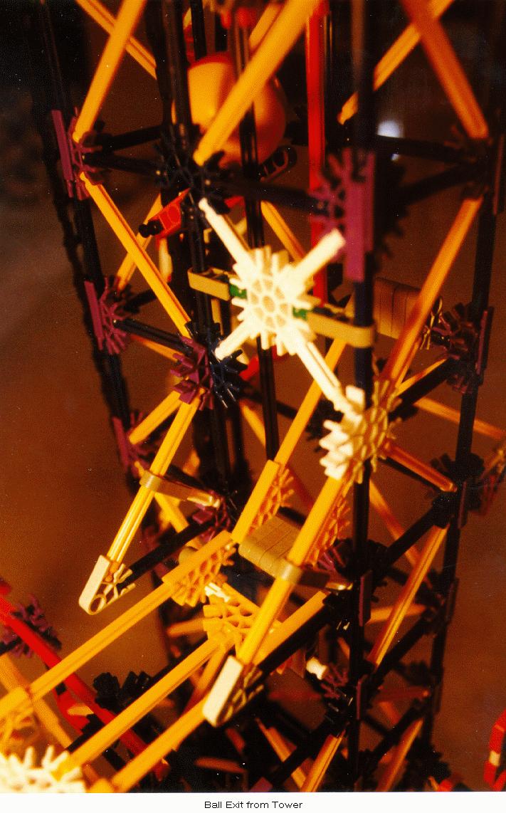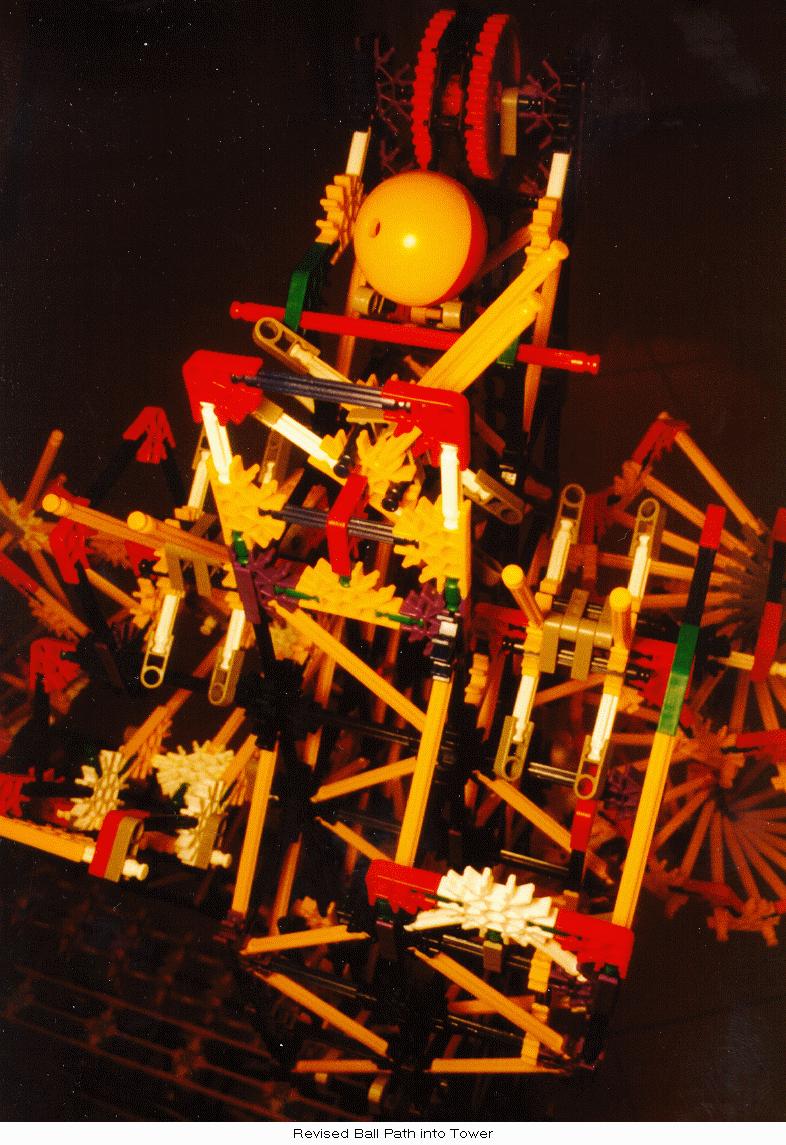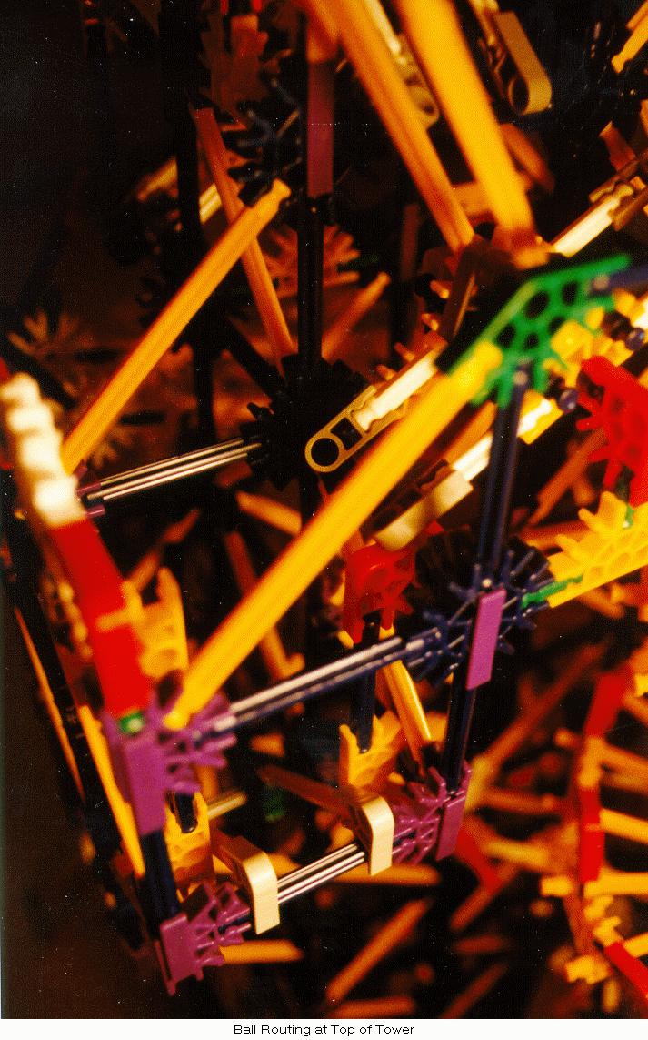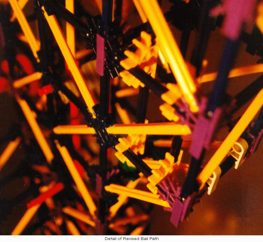 Due to occasional "excited" balls, simple guides were added at the bottom of the tower to restrict balls onto the horizontal channel. Finally, a more substantial ball stop was added at the left end of the horizontal channel since ball velocities at that point are often higher than in the original design. Also, new diagonal yellow-rod cross members were added to the inside of the left-hand tower to prevent the occasional errant ball from escaping its short vertical path through the tower.