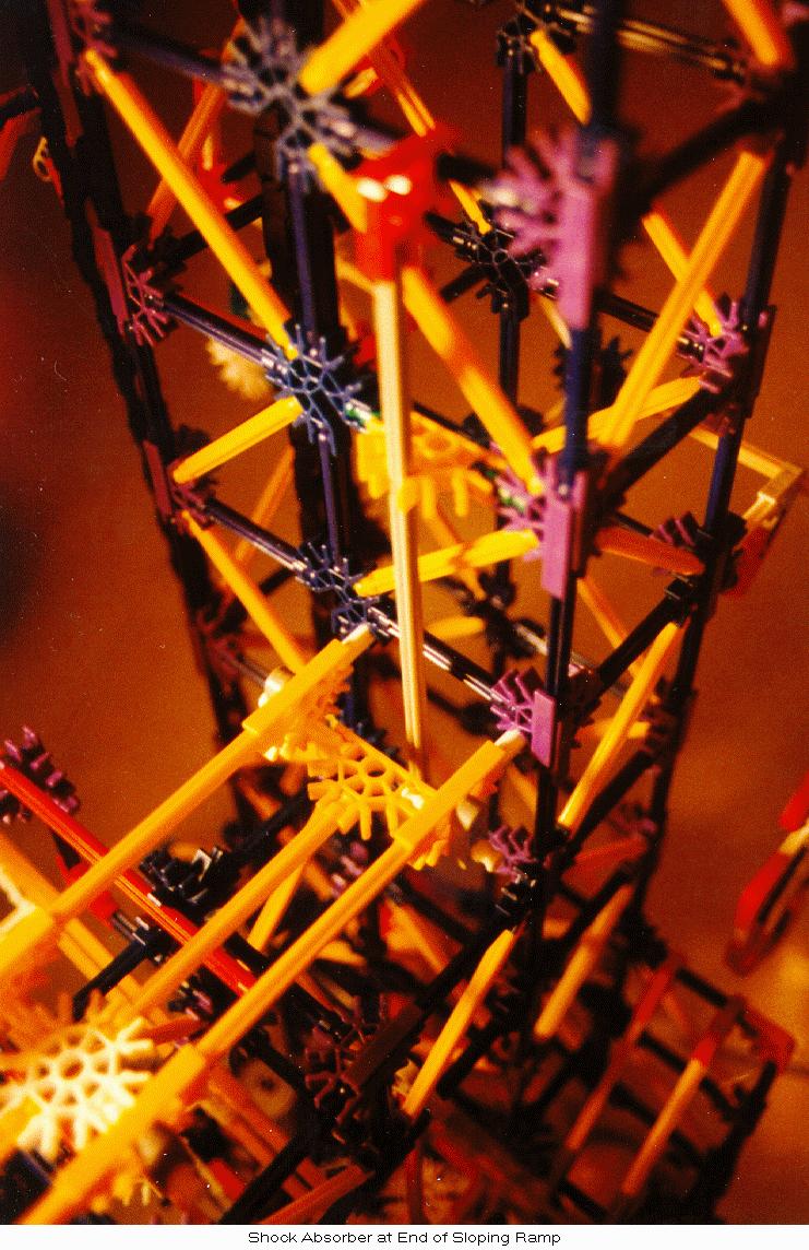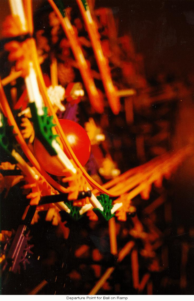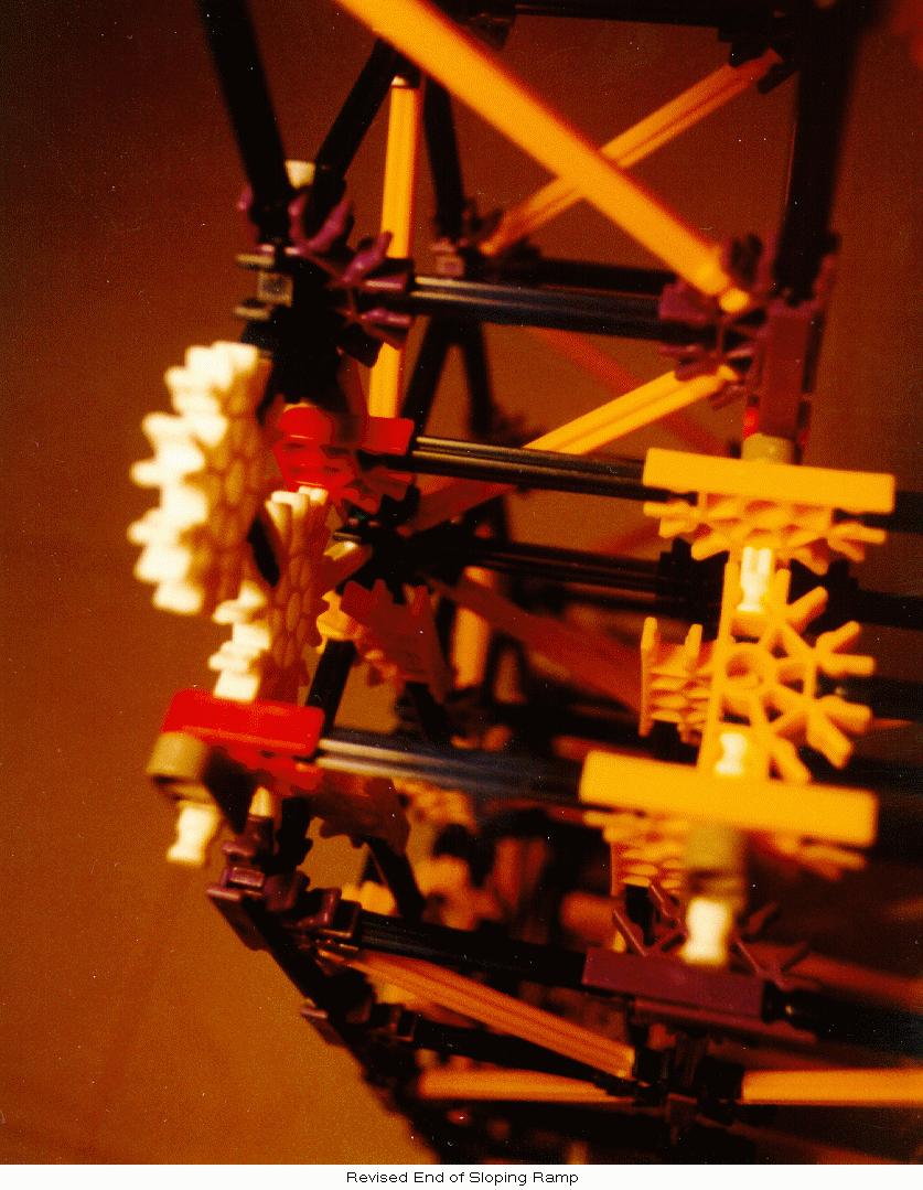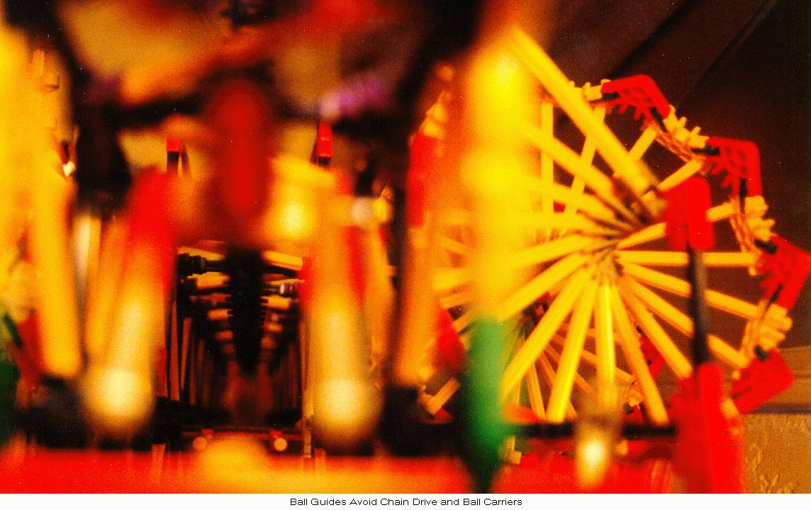 Due to occasional "excited" balls, simple guides were added at the bottom of the tower to restrict balls onto the horizontal channel. Finally, a more substantial ball stop was added at the left end of the horizontal channel since ball velocities at that point are often higher than in the original design. Also, new diagonal yellow-rod cross members were added to the inside of the left-hand tower to prevent the occasional errant ball from escaping its short vertical path through the tower.