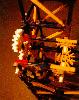 Inside the tower, the ball drops several cubes before exiting the tower onto the original target channel. The main difficulty in the new design was in preventing balls from jumping out of the forward part of the main tower into the rear part where the chain drive is running. The most reliable way of doing this is to provide pairs of vertical red-rod rails attached with orange connectors to horizontal red rods snapped into the connectors joining the sides of the two tower columns. Downward-sloping dark-grey connectors are used to keep the pairs of ball guides properly separated so that balls cannot pass between them. The use of orange connectors prevents any protuberance into the rear chain-drive channel, which might cause jamming with the ball-carrier arms attached to the chain. At the bottom of the tower, another set of diagonal rails sends the balls onto the horizontal target channel.