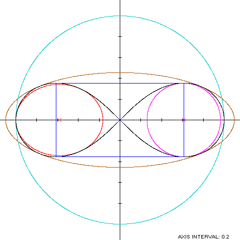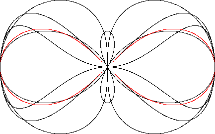 The Lemniscate of Bernoulli (red) is a member of a group of figure-8 curves described on these pages, including (inside to outside) the dumbbell curve, the bowtie, the Lemniscate of Gerono and the dipole: