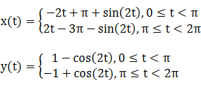 Since y(π - t) = y(t) and the path of the lower arch is a point reflection through the origin of the upper arch, S is bisymmetric. Its abscissa extrema are (±π,0) and its ordinate extrema (0,±2), so the width x height of its bounding rectangle is 2π x 4. Its perimeter is double that of one cycloid arch:![]()