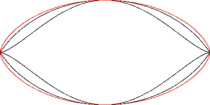 The cycloid (red) is a member of a group of similarly-shaped figures described on these pages, including (inside to outside) the mouth curve and the Vesica Piscis: