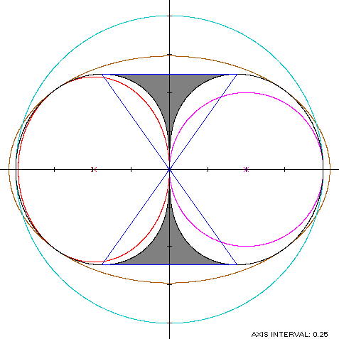 Figure Parameters Perimeter Area Centroid Incircle (lobe) R = 1/2 3.141593 0.785398 (0.5,0) Inellipse (lobe) 3.446495 0.930842 (0.491859,0) Dipole 7.16557 2 Convex hull 5.460413 2.177324 Circumellipse 5.636992 2.418399 Circumcircle R = 1 6.283185 3.141593
