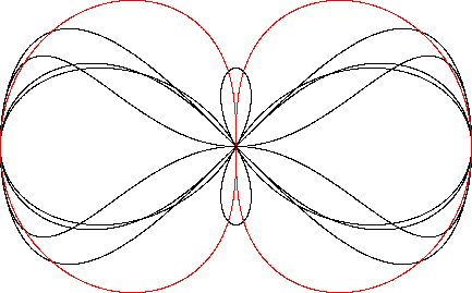 The dipole (red) is a member of a group of figure-8 curves described on these pages, including (inside to outside) the dumbbell curve, the bowtie, the Lemniscate of Bernoulli and the Lemniscate of Gerono: