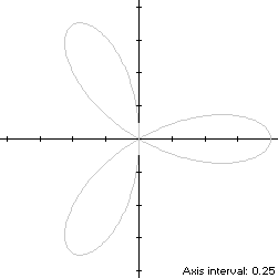r(t) = cos(3t), 0 ≤ t < πThis curve is also known as the trifolium. Movement along S is always counterclockwise, starting at its maximum abscissa point (1,0) and crossing the origin three times. There are two minimum-abscissa points