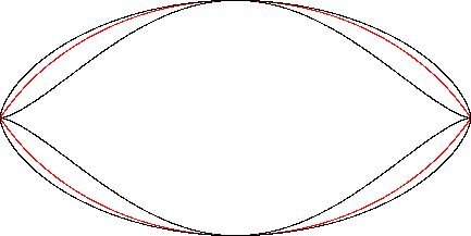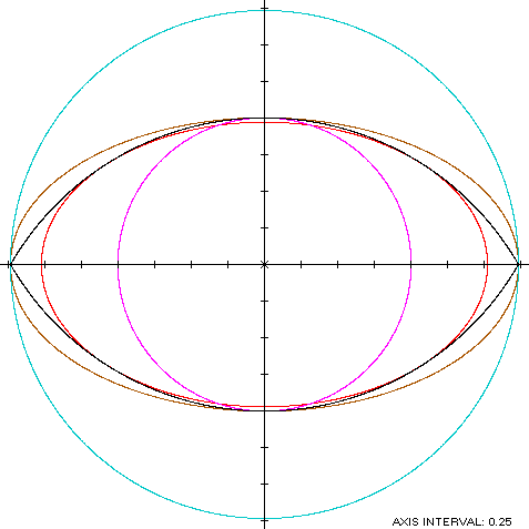 The Vesica Piscis (red) is a member of a group of similarly-shaped figures described on these pages, including (inside to outside) the mouth curve and the cycloid: