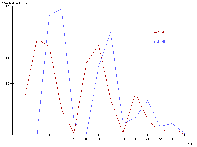 In contrast to the grayscale representations shown earlier, the score probability distribution function (pdf) can be plotted in the usual way. The following graph shows the score pdfs for the standard (4,6) game with Mastermind-type scoring. There is some skew toward higher scores for non-repeated symbols (blue) as compared to repeated symbols (red).