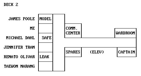 Go to the wardroom Use the viewscreen controls, get plastic card [3] If desired, enter captain's stateroom and use the computer terminal (captain's log) Go to the elevator Push the elevator call button Enter elevator Put the plastic card in the slot Use the elevator controls Go to Deck 5 [4] Enter Science Lab Open the storage cabinet marked "FRT" Take the Geiger counter Take the scanner Take the elevator to Reactor Spaces Go down the ladder to the access tunnels Turn on Geiger counter Move the mouse cursor to the Map button at upper right to determine which Reactor Spaces level you're on Using the following map, take the safe route: A1 -----> B1 -----> B2 -----> A2 -----> A3 -----> A4 -----> B4 LEFT DOWN RIGHT DOWN DOWN LEFT -----> B5 -----> A5 -----> Engineering DOWN RIGHT DOWN