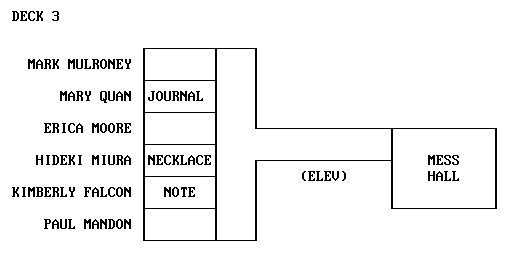 Take elevator to Deck 3 Enter Kimberly Falcon's stateroom using VIS override code L6EC Open the desk drawer Look in the desk drawer Read Falcon's note, get James Poole's VIS override code IH31 Enter Hideki Miura's stateroom using VIS override code F111 Take the necklace, notice its pi symbol [7] Take the source code Use the computer terminal Program the computer terminal with the source code, note pi result Enter Mary Quan's stateroom using VIS override code JU88 Take the journal Read the journal [8] Take the elevator to Deck 6 Go to the cargo bay Take the multitool Take the elevator to Deck 2 Enter James Poole's stateroom using VIS override code IH31 Take the ship model [9] Disassemble the ship model with the multitool Listen to the transmitter Open the envelope Read the letter Go to the wardroom Put the key in the keyhole of the display case [10] Take the ship model Disassemble the ship model with the multitool Read the metal cylinder Open the antimatter bomb Press the large button on the left to disarm the bomb