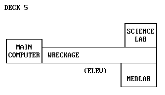 Take the elevator to Deck 5 Go to the Medlab At the Medical Officer's console, read the taped note, get 911 panic code Go to the wreckage in the corridor [11] Ignite the cutting torch Clear the wreckage with the cutting torch Put out the cutting torch Open door to computer room Enter pi code: 3141 Open the panel in the Cyber Systems control console Read the Post-It Press the rightmost of five switches [12]