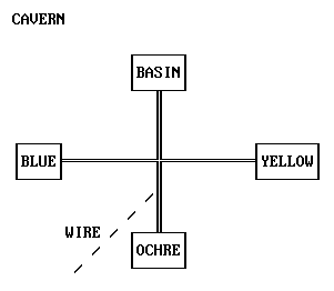 Turn around and move forward all the way to the back of the (Basin) cavern Go down into pyramidal depression Take the yellow crystal rod Take the blue crystal rod Enter the pyramidal depression in the Yellow cavern Put the yellow crystal rod in the square slot Take the yellow prism Enter the pyramidal depression in the Blue cavern Put the blue crystal rod in the square slot Take the blue prism Return to the pyramidal depression in the Basin cavern [36] Put the blue prism in the square slot Put the yellow prism in the triangular slot Ignite the cutting torch Melt the blue prism with the cutting torch Melt the yellow prism with the cutting torch Put out the cutting torch Go to the pyramidal depression in the Ochre cavern Take the octagonal ochre block [37] Return to the pyramidal depression in the Basin cavern Put the octagonal ochre block in the basin Put the metal fragments in the basin, watch animations [38]