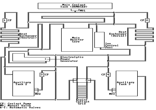 Manual Valve 3 starts out open. For the moment, leave Coolant Pump 4 off. Leave Valve P in its default state connecting pipes above and below. Change Valve M to connect pipes right and below. Change Valve F to connect pipes left and below. Change Valve E to connect pipes right and above. Change Valve B to connect pipes left and below. Change Valve C to connect pipes right and below. For the moment, leave Coolant Pump 1 off. Activate Coolant Pump 4 and verify coolant flow up to Coolant Pump 1. Leave Valve G in its default state connecting pipes right and above. Leave Valve H in its default state connecting pipes right and above. Change Valve D to connect pipes left and below. Change Valve K to connect pipes left and right. Leave Valve J in its default state connecting pipes right and below. Change Valve O to connect pipes right and above. Change Valve R to connect pipes above and below. Leave Valve S in its default state connecting pipes right and below. Activate Coolant Pump 1 and verify coolant flow through the Main Reactor Core, Ion Control Pool and Engine Coolant Grid to Auxiliary Tank 3. [6]