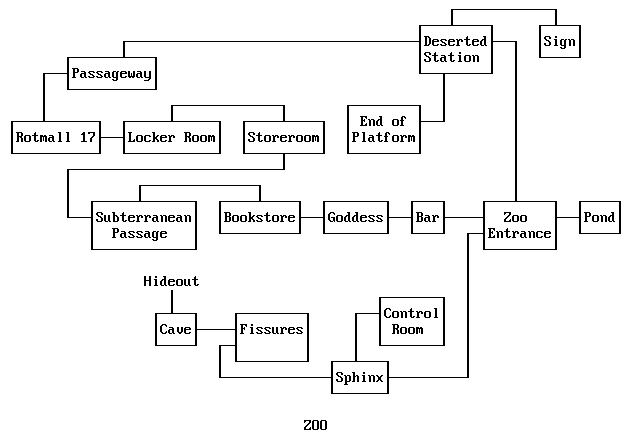 Use graphic wheels according to standard procedure.Return through the zoo entrance to the deserted station and use the debris passage to cross to the other side. Return via the passageway at left to the Rotmall 17 subway station. Combine the magnet with the crowbar in your inventory. Use the resulting magnetic bar to capture the chain dangling from the ceiling and cross to the other side. Re-enter the locker room and use the oilcan on the hasp of the heavy door in the center of the room. Use the hasp to open the door and go inside the darkened room. Open the trapdoor in the floor and go down into the subterranean area you may have visited earlier from the trapdoor in the workman's closet. Open the door at the far end of the ledge using the key in your inventory. Enter the doorway and pass through a well into the zoo bookstore. Remove a light bulb from the lamp on the desk at lower left. Pull a book from the middle shelf in the section immediately to the left of the well. Use the book in your inventory to find symbols corresponding to the control room access code: