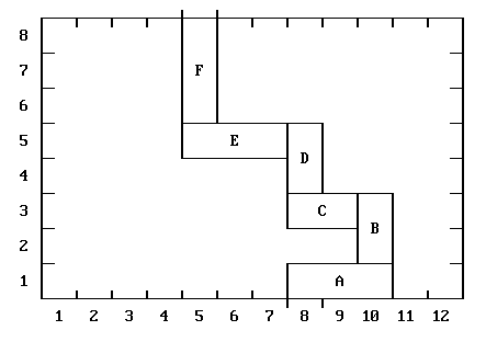 By similar reasoning, the only remaining piece within reach of D is C; piece D must be positioned to cover rows 4 and 5. Likewise piece C covers columns 8 and 9, in order to reach piece B, which in turn covers rows 2 and 3 and abuts piece A covering columns 8-10.