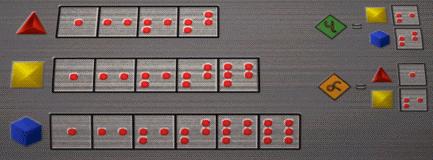 This indicates the purpose of the processing chamber is to transform element 4 (green rock) into element "alpha", which remains to be defined. Move R F L F through several doorways into a chemistry lab. Note the vials of red, yellow and blue fluids at left, and the single vial of green fluid at right, identified with the 4 element symbol. Move R, drag the left-hand video cartridge into the slot below the display screen and press the top triangle button to play it. Here, you learn that red-red and red-yellow combinations are possible, but not red-blue ones. Remove the first video cartridge and insert the other one to learn that when a red triangle with more dots is combined with a pair of red triangles with fewer dots, the triangles are exchanged so that the pair of triangles contains the ones with the larger number of dots.