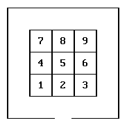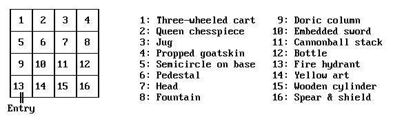 To find success, you must first trap inspirationand you'll see a mechanical man move amongst the squares of the piazza courtyard. Move F4 R F L F L F onto the piazza balcony. Here there is a miniature of the piazza courtyard and you can practice putting the Lilah piece on any occupied square, thus disclosing the location of the mechanical man piece. After playing the miniature game, you'll see that the both pieces must move to an adjacent non-diagonal square every move, and the musical cadence that plays at the end of the move indicates the proximity of the two pieces - the fewer the notes, the closer they are together. The object of the puzzle is to trap the mechanical man into occupying an open square and becoming visible. This puzzle is easier to solve in the full-scale version, so move B L F back onto the piazza courtyard. Click on each of the courtyard pieces until you find the location of the mechanical man. Note that the piece you click on disappears; you'll need to use this feature to your advantage when trapping the mechanical man. The mechanical man can be trapped only in a corner of the courtyard. Note that your game cannot be saved, restored or even quit while you're inside the piazza. Starting from a position just outside the piazza, and using the following courtyard map