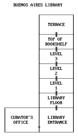 On level 1 of the library, repair the ladder with the blind man's stick. Go up the ladder to the next level. Right-click the "empty spaces" hotspot on the third shelf to the left of center. Place the three books from your inventory on the shelf, in chronological order left to right (Sophocles, Shakespeare, Goethe). When the stairs appear, climb them up to level 3. On this level, there is a switch amongst the books, but it has no apparent function. Try several times to walk past Diane to the right end of the ledge, until she lets you by and you find a staircase up to the next level. Move the rightmost statue to open a panel (hiding box) in the center statue. Click on the hiding box and pick up a key. Use the key to unlock the glass doors, and exit to the terrace.