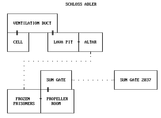 Eagle Castle? This must have been borrowed from the movie Where Eagles Dare. In your cell, pick up the items from the table and use the spoon on the left cell wall. Each time Professor Parker talks to you, immediately stand up or the German guard will see you and you'll be shot. Pick up the stool in your cell. After Hamsun, Diane and Professor Parker have been taken from their cells, Dietrich will give you some paper and a pen to write a message to Washington.