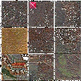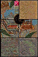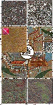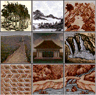 Exit the room, move R2 F R and enter the northwest room. Turn left and zoom in on the Feng-Shui puzzle. The object of this puzzle is to move eight of the nine pieces at left into the empty grid at right while maintaining a center house image that is the same as the rightmost (most complete) in the row of five shown at the bottom. The solution will satisfy the requirements of Feng-Shui landscape design as stated in the Archives: