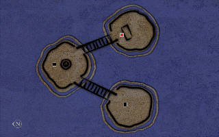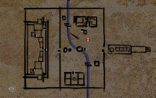 Proceed east and make note of a crossbow immediately north of the eastern footbridge. Cross the bridge, turn left and zoom in on the four soldier statues along the north wall of the workshop. Pick up an Arrow from the pile on the ground. Move LF and release the waterwheel brake. Move R F2 and load the arrow into the crossbow. Fire the crossbow to start the river flowing.