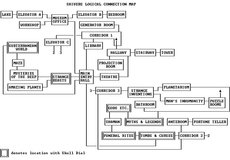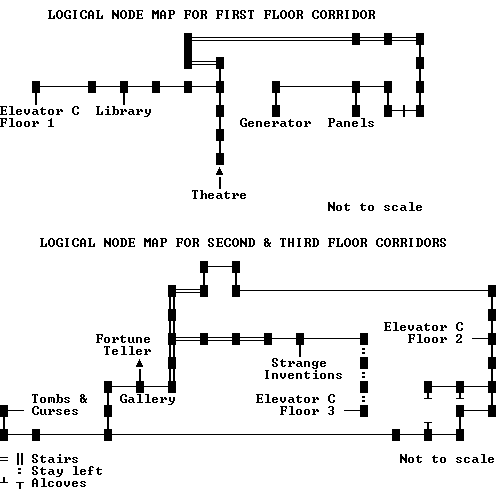 There are only 20 saved game slots, with names limited to 8 characters without numbers. More numerous saved games can be manipulated externally by copying groups of files in the \Saves subfolder of the game installation location. When starting a New Game, your entry in the "Museum Guests" book becomes the name of your first saved game. This walkthrough uses the following abbreviations for the node-based movements in the game: