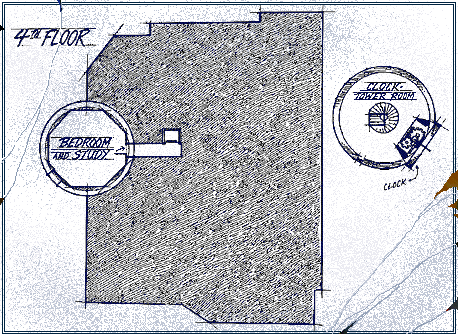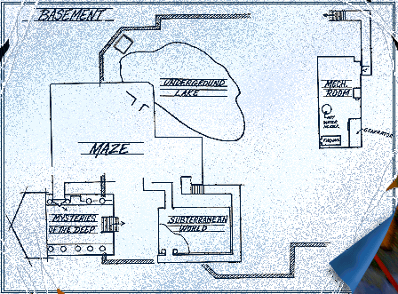 There is a map on the wall with Atlantis (Bimini Island) coordinates circled (75 W, 20 N). Backstory items here include a letter in the upper-right desk drawer, a scrapbook and tape recorder on the desktop, and a newspaper in the pocket of the hanging coat referring to the lost teenagers Beth Nelson and Merrick Campbell. Elevator B to Windlenot's bedroom can be accessed under a tapestry to the left of the door to the main hall.