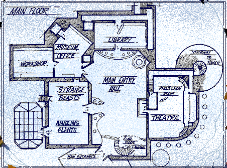 Once inside the theatre, climb onto the left side of the stage and proceed through a hallway to the first corner. Here there is a pointed wooden door with a word wheel puzzle on it that provides access to the clock tower, as shown on the Main Floor Map. Continue down the hallway to the next corner. Turn right and note an access hatch that can be opened with the blue button at upper left. This provides a one-way path into Corridor 1 behind the library. Continue around the corner and climb the stairs into the projection room. At left is a stack of film canisters where the Metal Ixupi sometimes lurks. Move towards the far corner of the room where the projector stands. Click a few times on the upper reel to rewind the film and make the button at lower left turn green. Press the green button to watch the movie. Professor Windlenot, sounding like David Attenborough, is dressed like the corpse seen earlier on the shore of the underground lake, so that must have been him. Playing the movie opens the curtain on the right side of the stage and allows a pot/lid behind the podium to become accessible.
